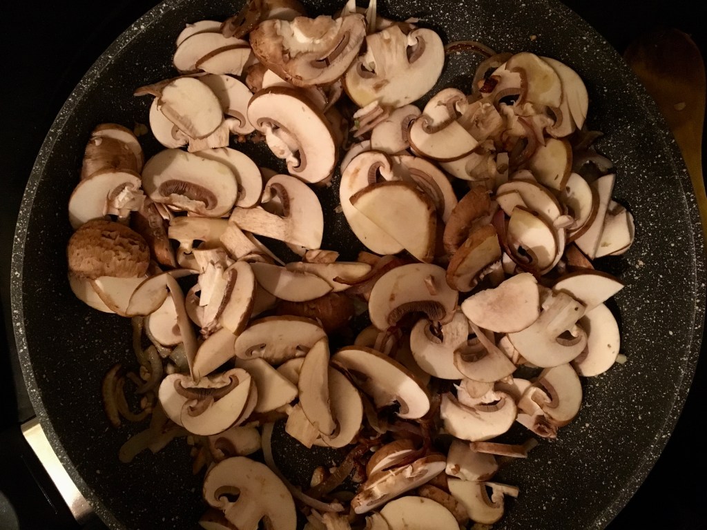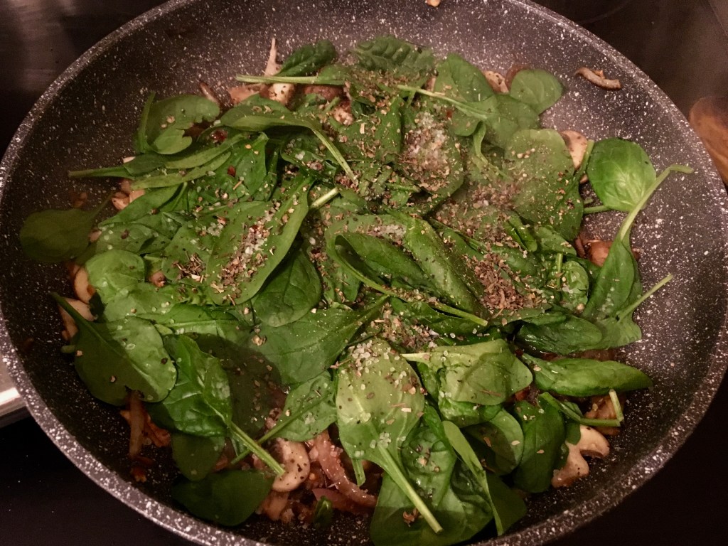 A scan of the produce in my fridge told me the big container of mini bellas from Costco could help me out. Likewise for the baby spinach and the awesome double package of goat cheese. Throw in some garlic and we have a medley that can’t go wrong.