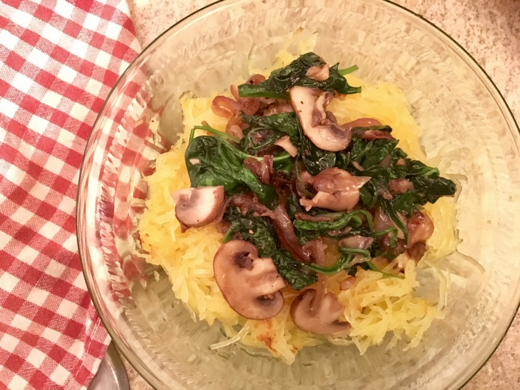At this point, I remove my df girl’s portion. Hers is served on spaghetti squash, drizzled with a little olive oil. You could continue on with the recipe, substituting a dairy-free cream cheese, like Daiya, instead of the goat cheese as an alternative option.
