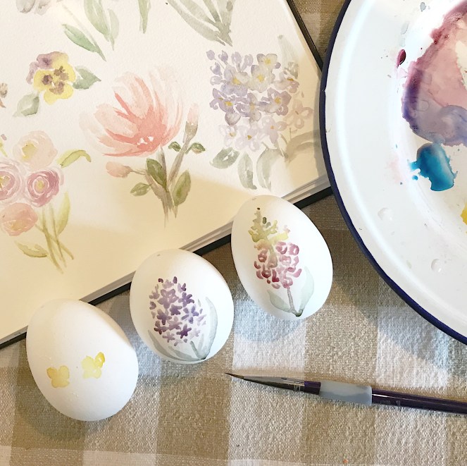 It just so happened that I’d watched a spring flower painting class by Neesha on Skillshare. It was very enjoyable and inspired me to paint a couple of these spring-y florals (plus a pansy) on my prepared eggs.