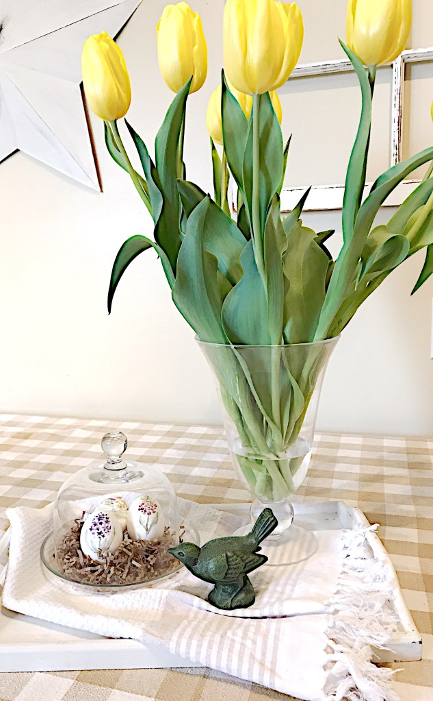 My Love recently gave me a lovely bunch of yellow tulips on my birthday. (Could anything be more sunshine-y, save the sun itself?). It was looking a little lonely on my table. I put it on a tray. Then added a cute fringed towel. It still looked alone.