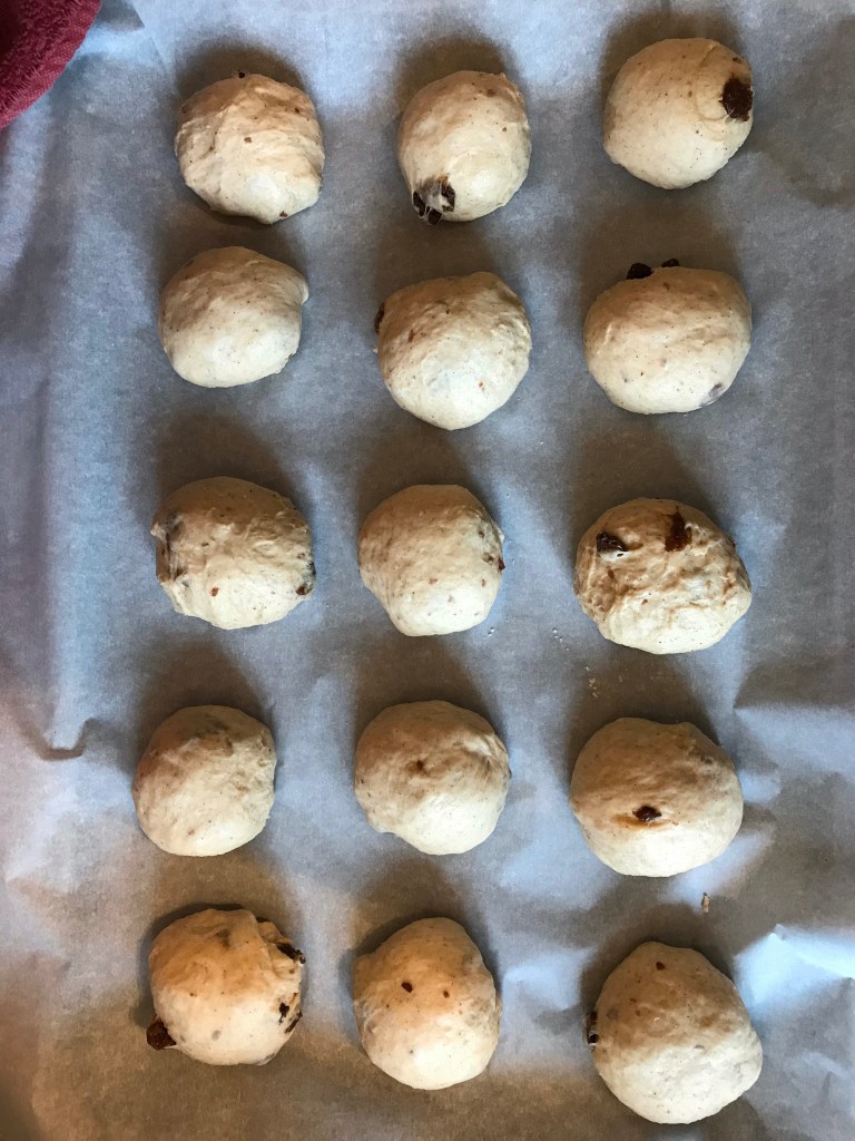 Punch dough down once double and divide into 12-16 pieces, forming into balls. Place on parchment lined pan about 2 inches apart. Lightly cover and allow to rise again for about an hour until doubled in size.