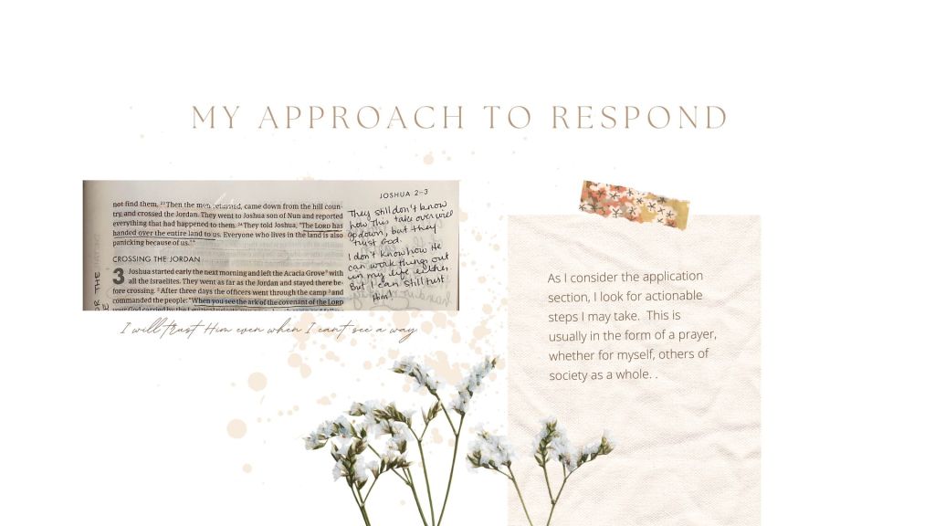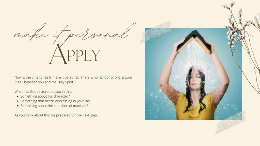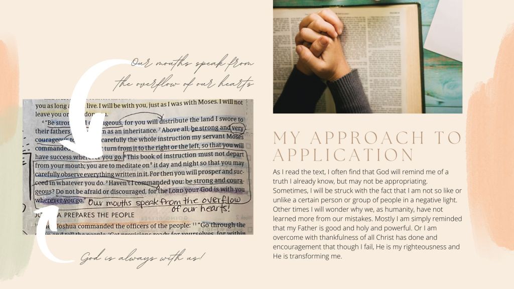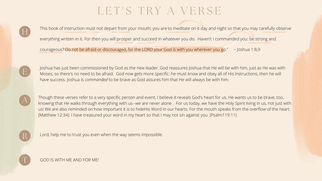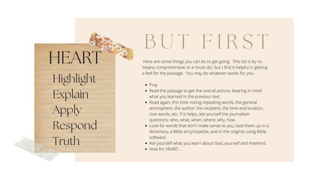 One evening that I facilitated our women’s Bible study, I put together the slideshow below to show how to approach HEART in a practical, step-by-step way (click on right side to proceed through the slides). We were going through Joshua at that time, so I used examples from that week’s homework.