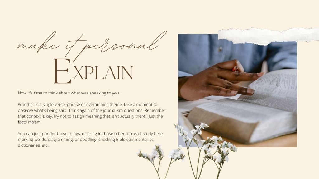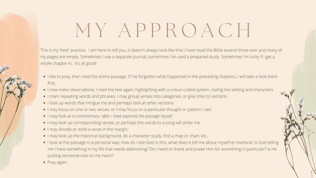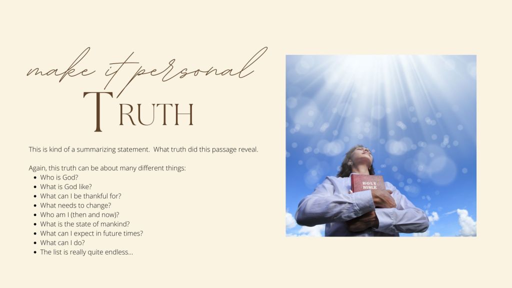 - I consider the passage in a personal way: what does it tell me about God, what does it tell me about myself or mankind, is there something in my life that requires attention, what do I need to thank or praise God for