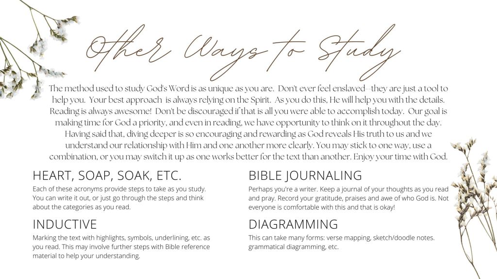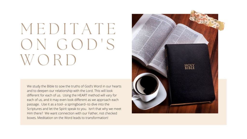 Our Women’s Bible Study group just finished up The Bible in a Year by Kandi Gallaty (it was so good to go through the Bible chronologically!). In this study, she suggests using the HEART method to meditate on what we’ve read. Some of the sweet ladies in our group were finding this distracting and difficult. I encouraged them to remember that Bible study methods are just tools–not rules. The purpose of reading, meditating and studying the Bible is to draw near to God and to grow as Christians. We are not ‘filling a bucket’ with knowledge, we are ‘lighting a fire’ of transformation! We never need to follow our methods slavishly. I remember a friend once said she gave up on a ‘reading through the Bible in 90 days’ challenge (or something like that) because it was interfering with her quiet time with the Lord. She was so driven to keep up that she felt she was missing out on quality time with God and time to just meditate on what she read.